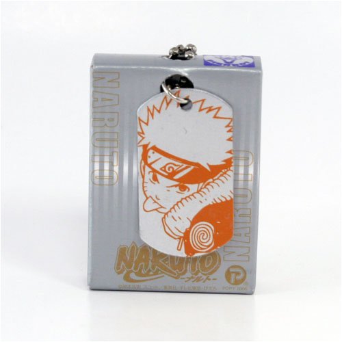Dog tags of characters from Naruto. Tags measure 4 cm (1 1/2 inches), plus the length of the chain. Chain in key chain length, but can be attached to longer chains. Village symbol on the back, with the character on the front. Packaged on a character box, with plastic cover.